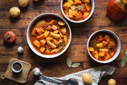 Einfaches und nahrhaftes Kürbisgulasch mit Kartoffeln und Linsen Das vegane …