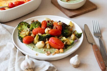 Mediterranes Ofengemüse, ein nahrhaftes und proteinreiches Gericht mit Spinat Hummus …