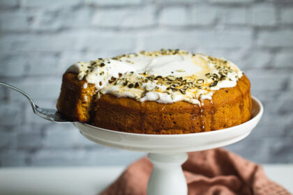 Einfacher und veganer Kürbiskuchen mit fruchtiger Zitronencreme Der Kürbiskuchen wird …