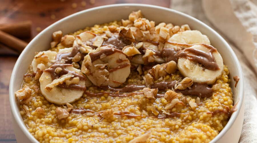Veganer Hirsebrei mit Banane und Orangensaft, ein nahrhaftes und einfaches …