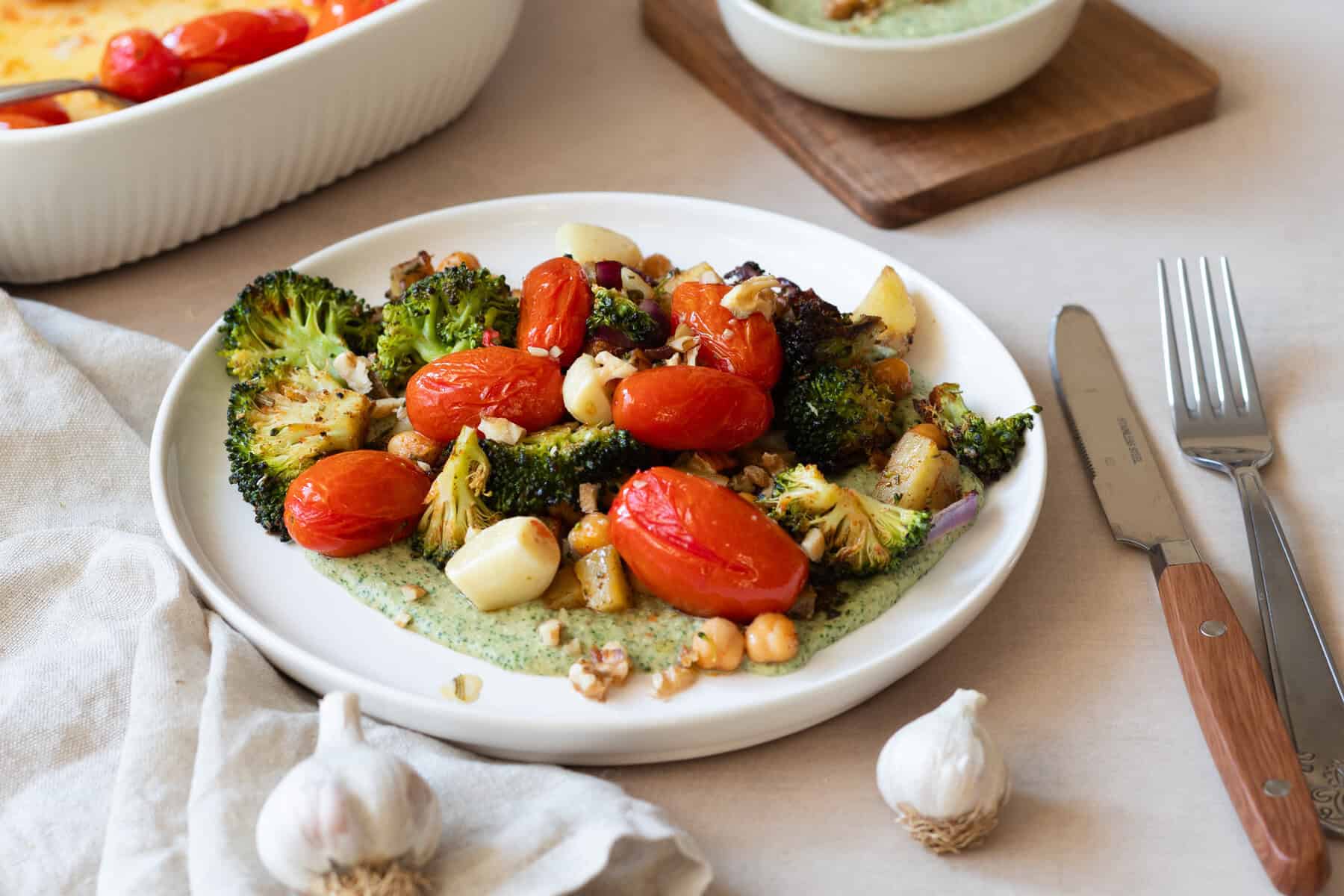 - Wenn das Ofengemüse fertig gebraten ist kannst du das Gericht anrichten. Verteile dafür zuerst den Dip auf einem Teller und richte dann das Ofengemüse sowie die Tomaten und Knoblauchzehen darauf an.