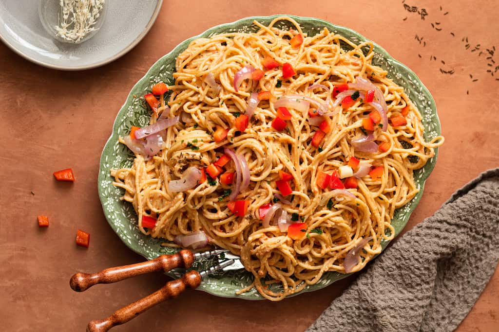 Vegane Spaghetti mit Paprika und Zwiebeln, verfeinert mit veganer Kochcreme.