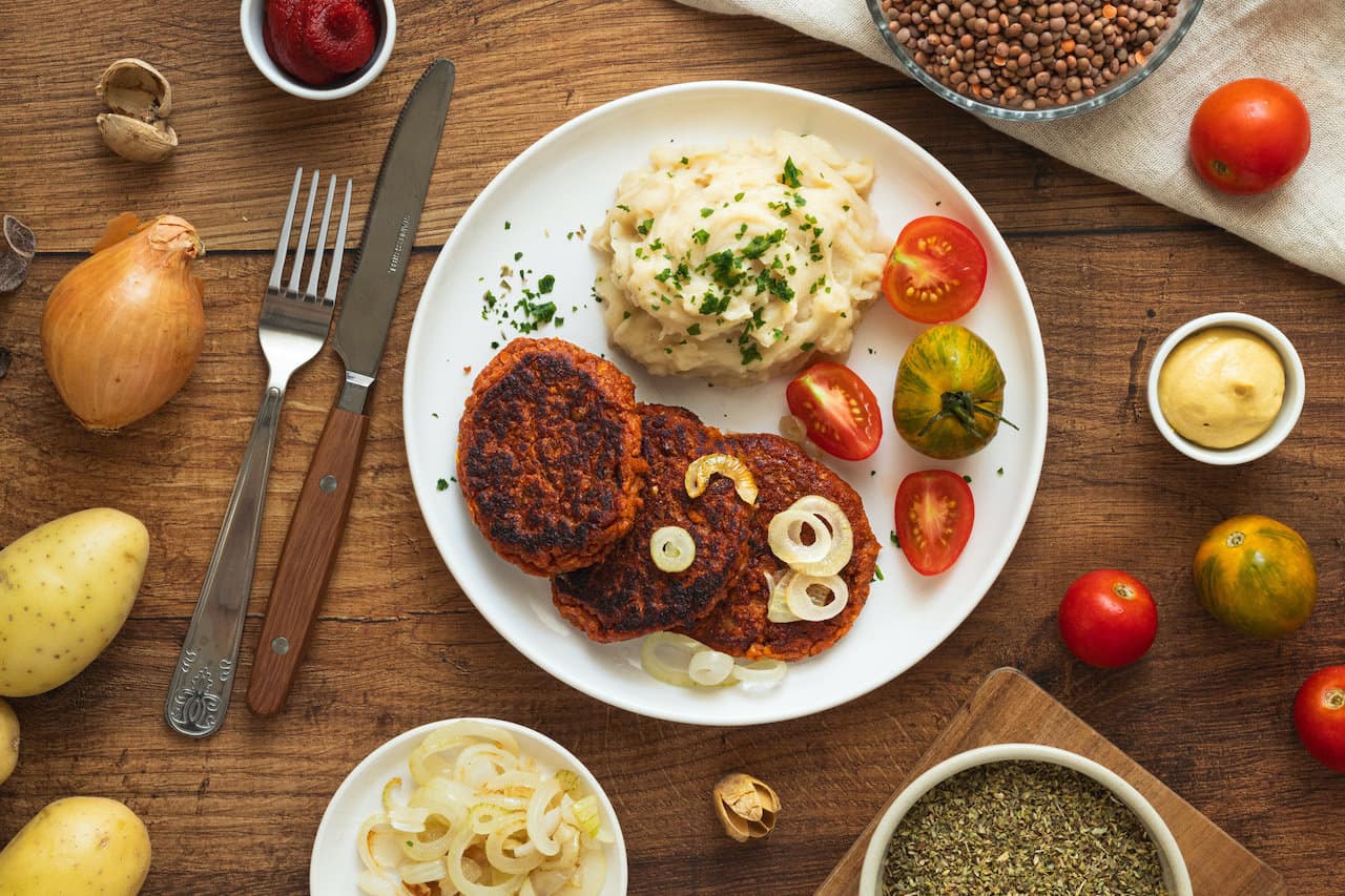 Du brauchst Zutaten wie Linsen und Sojagranulat und einen Pürierstab für die Zubereitung. Serviere die veganen Fleischlaibchen am besten mit Kartoffelpüree. Das Rezept für den Kartoffelbrei findest du weiter unten im Beitrag. Ideal als Beilage passt auch der Gurkensalat mit Tahin und Dille.