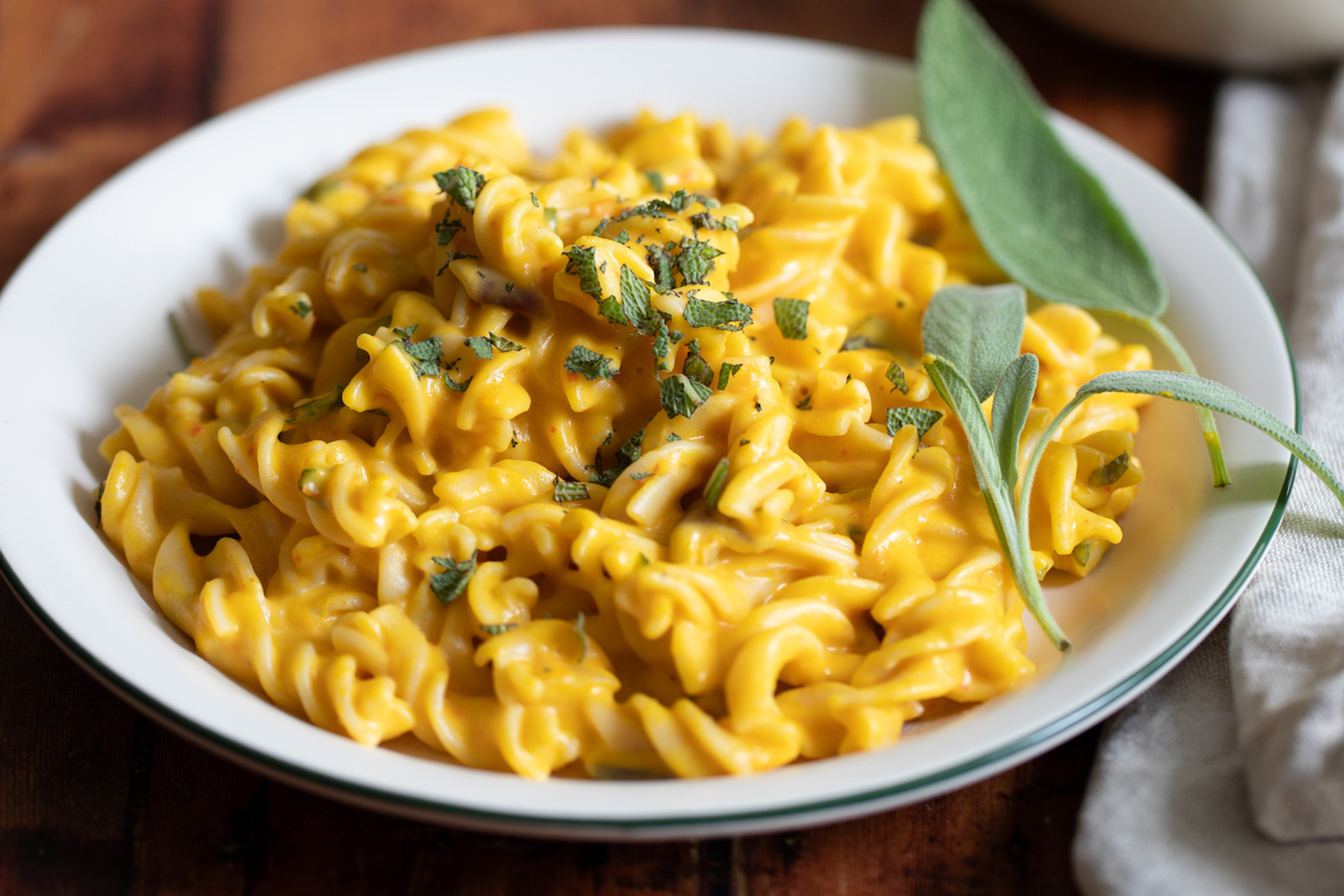 Alles was du dafür benötigst sind Kürbispüree, Pasta deiner Wahl und eine vegane Kochcreme. Mit etwas Salbei wird das Gericht zusätzlich verfeinert.