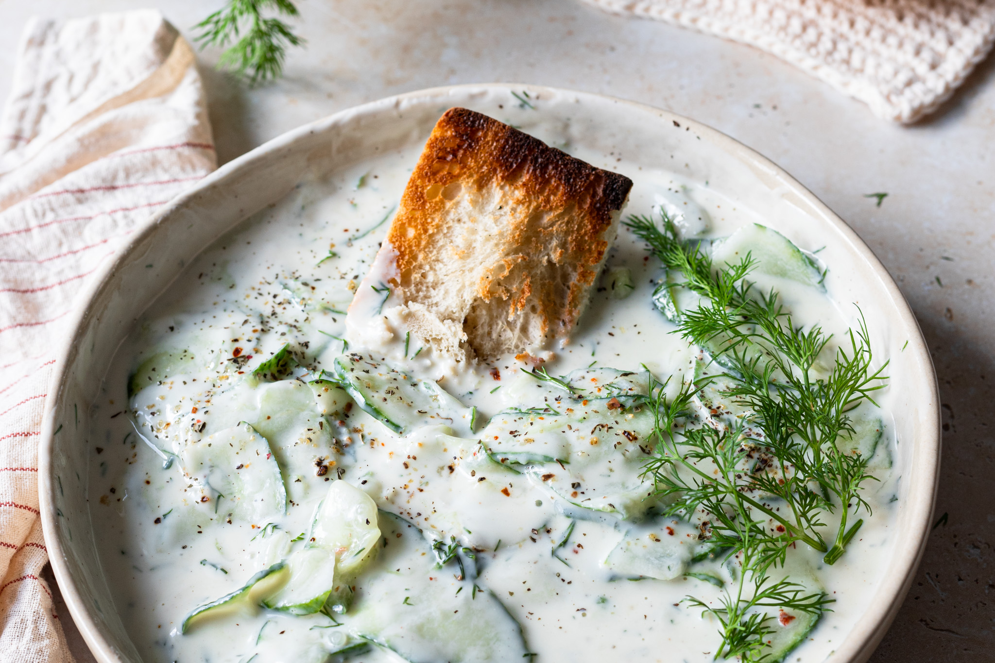 Neben der Hauptzutat, der Gurke, ist auch das Joghurt ein wichtiger Bestandteil vom Rezept. Ich habe hier ein Sojajoghurt verwendet, alternativ funktioniert es auch gut mit einem Skyr Sojajoghurt, wenn du mehr Proteine in das Rezept einbringen möchtest. Ob das Rezept mit einem Joghurt aus Kokos oder Hafer auch schmeckt ist Geschmacksache, ich habe es bisher noch nicht ausprobiert 😉
