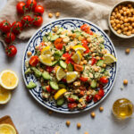 Außerdem empfehle ich dir den bunten und gesunden Couscous Salt, der mit Minze und Kichererbsen serviert wird.