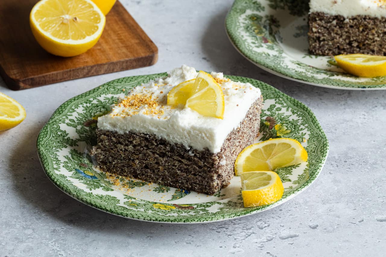 Veganer Zitronen Mohn Kuchen mit Kokos-Zitronen Frosting